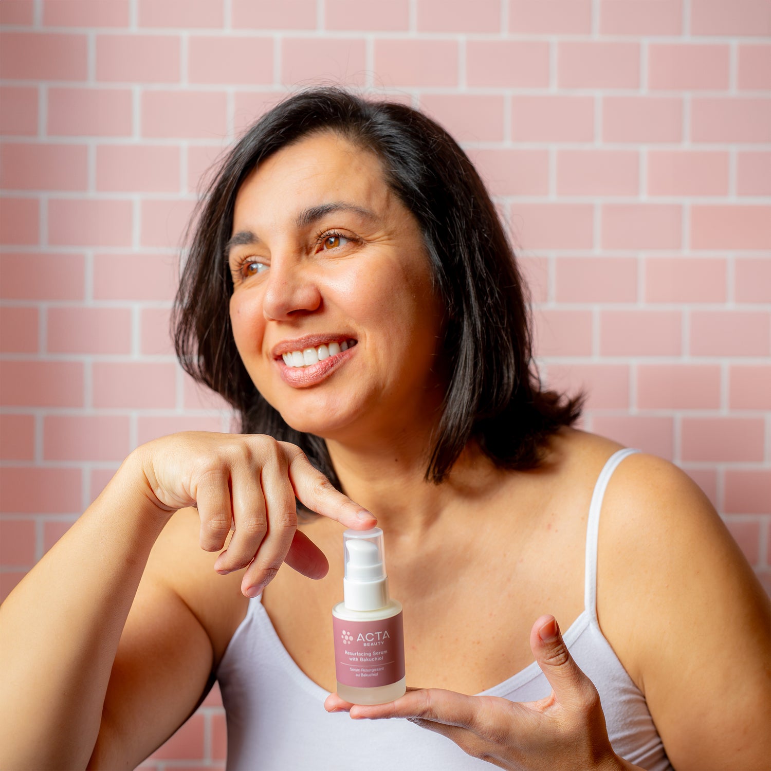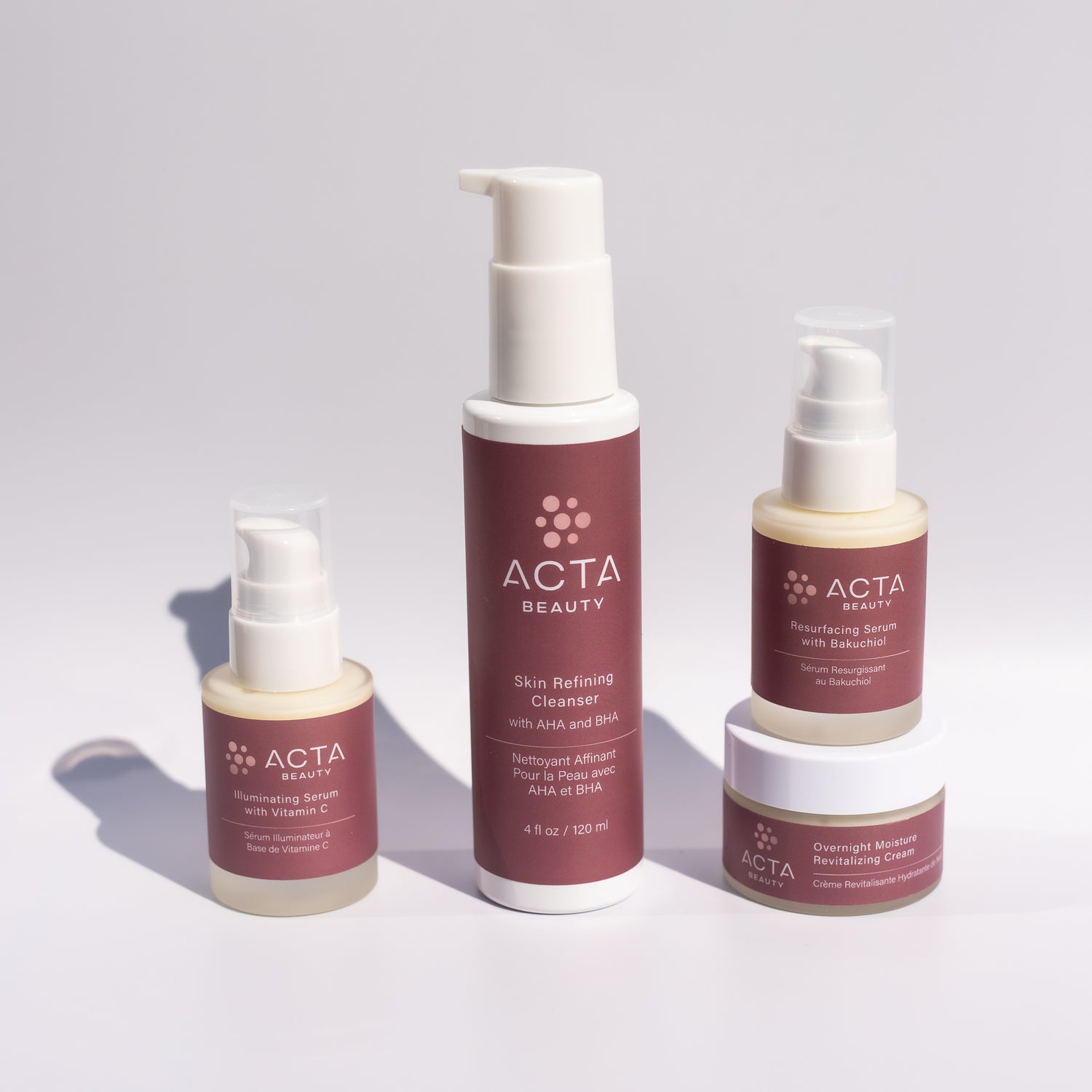 Acta Beauty formulates anti-aging products with active ingredients like vitamin C, bakuchiol, vegan collagen, botanical stem cells, and hyaluronic acid. We carefully select ingredients found in nature to support renewed skin.